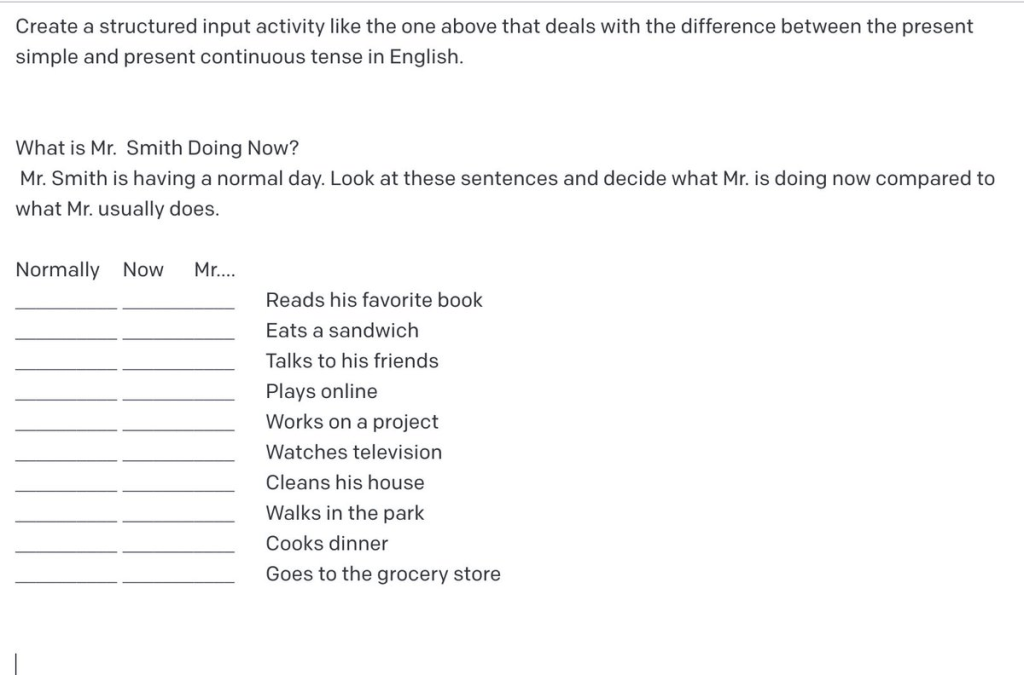 One thing a learned in trying to create more complex tests and activities is that providing good examples of what you are looking for can ensure better output. So I first tried to create a structured input activity by prompting OpenAI to essentially copy the form of a Spanish structured input activity to be used in English. Notice that I’m also instructing the AI to pay attention to particular properties of the task.
