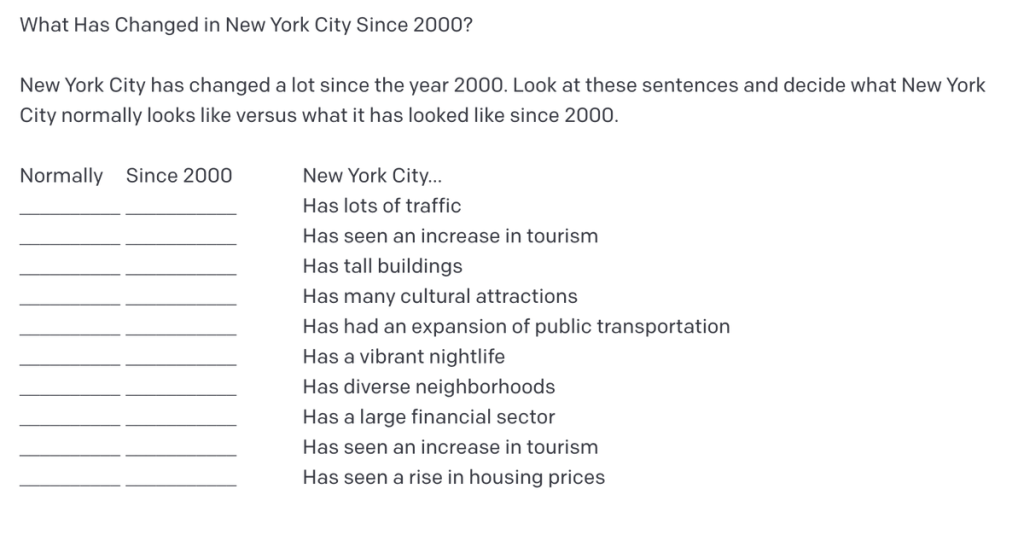 Here is my second attempt, focusing on a totally different form, and it took a fraction of the time. My prompt was “Create a structured input activity. The context is how New York has changed since 2000. Learners have to process present simple and present perfect sentences to complete the activity.”