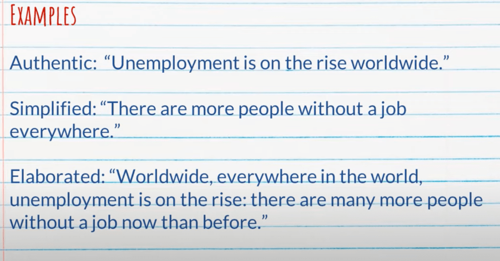 In the simplified version, the word “unemployment” is removed entirely, robbing learners of exposure to the word and a chance of learning it incidentally. In the elaborated version, which includes redundancies that might sound strange to a native or proficient speaker, learners get exposed to the word.